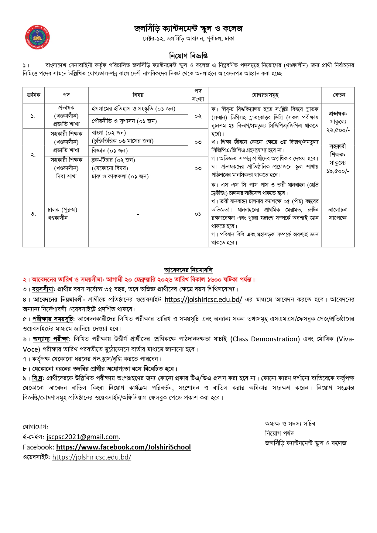 বাংলাদেশ সেনাবাহিনী কর্তৃক পরিচালিত জলসিঁড়ি ক্যান্টনমেন্ট স্কুল ও কলেজে নিম্নবর্ণিত শূন্য পদসমূহে নিয়োগের (খন্ডকালীন) জন্য প্রার্থী নির্বাচনের নিমিত্তে পদের সামনে উল্লিখিত যোগ্যতাসম্পন্ন বাংলাদেশী নাগরিকদের নিকট থেকে অনলাইনে আবেদনপত্র আহ্বান করা হচ্ছে।
